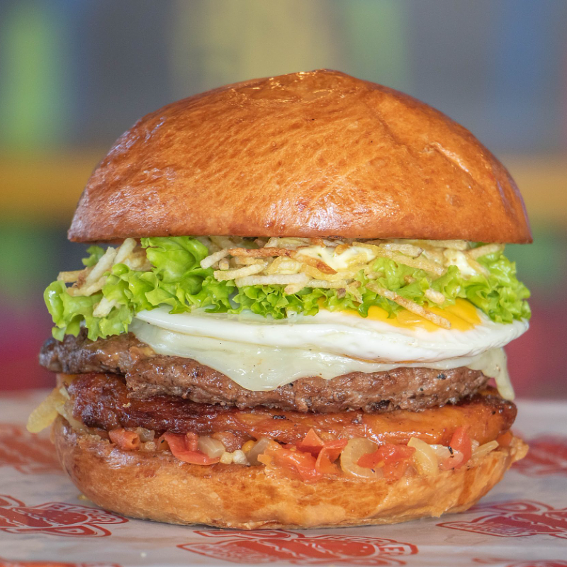 Hamburguesa con los sabores del campo, hogao, huevo y plátano maduro, queso mozzarella, salsa de tomate, BBQ y nuestra famosa salsa POP.