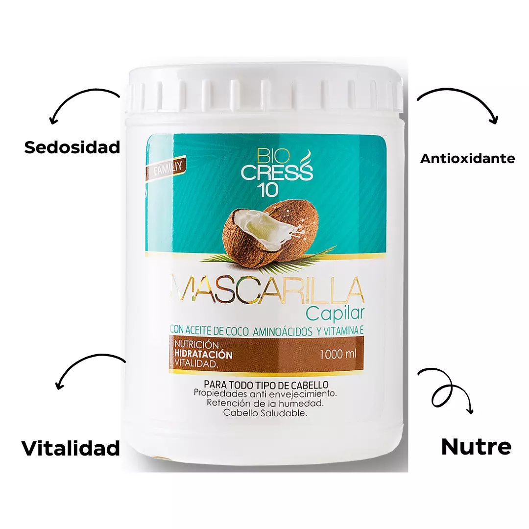 La mascarilla capilar de coco Biocress es natural y efectivo para el cuidado del cabello, elaborado a base de coco y otros ingredientes orgánicos de alta calidad. Esta mascarilla capilar está diseñada para hidratar, nutrir y fortalecer el cabello, dejándolo suave, brillante y saludable. El coco es conocido por sus beneficios en el cabello, ya que contiene ácidos grasos que ayudan a proteger y reparar el cabello dañado, a la vez que hidratan y suavizan el cabello. Además, esta mascarilla de coco BioCress contiene otros ingredientes naturales como la vitamina E y aminoácidos, que ayudan a nutrir y fortalecer el cabello, previniendo la caída y la rotura.