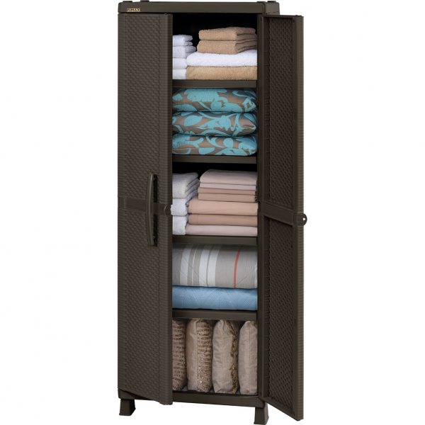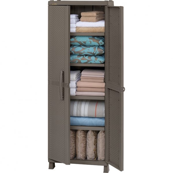 Armario plástico con apariencia rattan, elegante y funcional, ideal para organizar todo tipo de objetos en el hogar. Cuenta con 4 entrepaños ajustables, cada uno con una capacidad de carga de hasta 25 kg. Su diseño moderno y texturizado tipo rattan brinda un estilo artesanal y sofisticado a tus espacios. Fabricado en plástico de alta resistencia, fácil de armar, mover y limpiar.