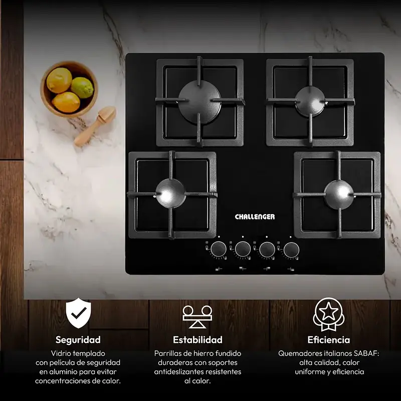 Equipada con parrillas de hierro fundido, soportes antideslizantes y perillas metálicas ergonómicas, esta estufa ofrece estabilidad, resistencia y confort en cada uso. Además, cuenta con empaques antiderrame que protegen el cristal y facilitan la limpieza, brindando máxima durabilidad y seguridad en tu cocina.