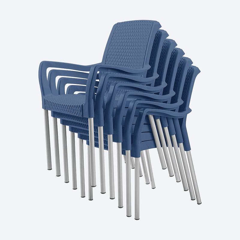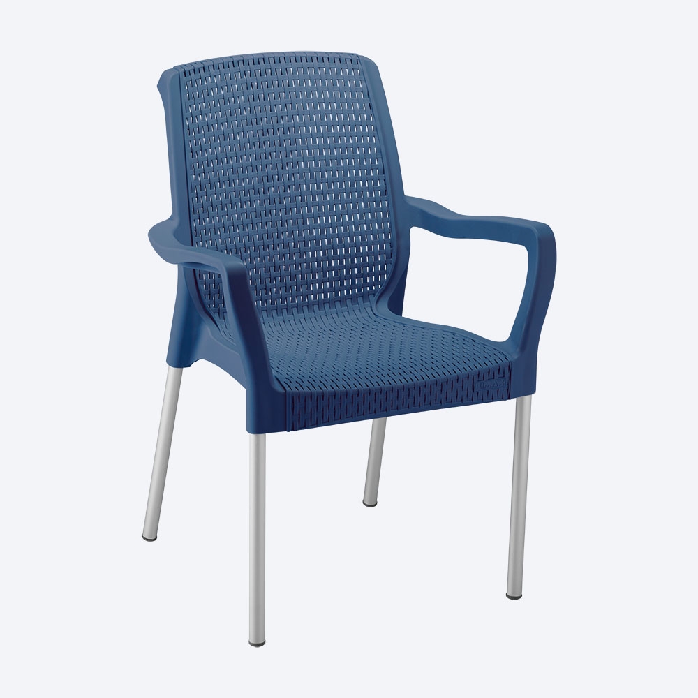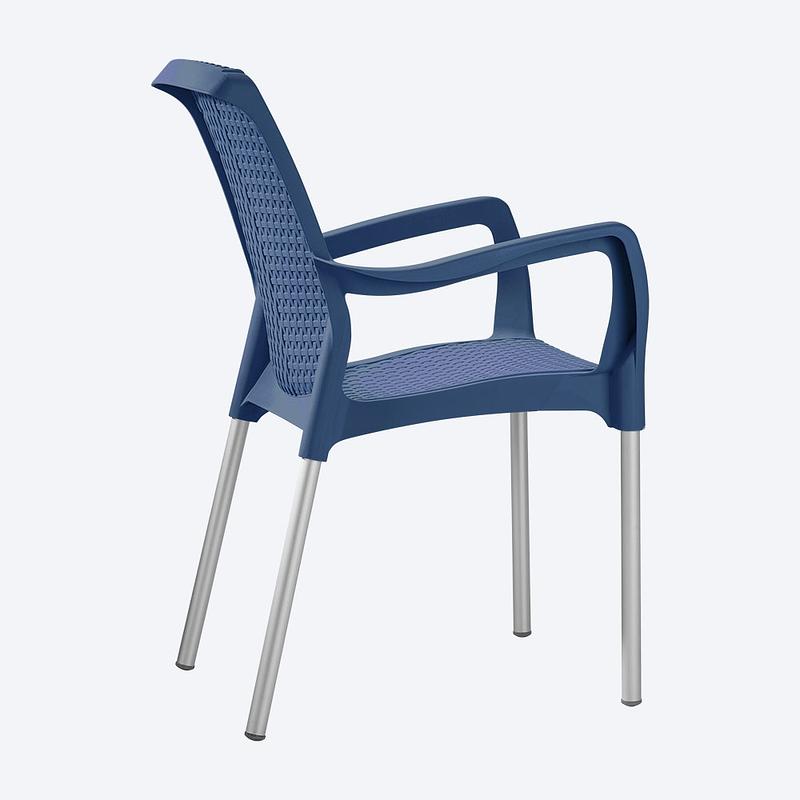 Silla SHIA de apariencia Rattan, con tejido perforado que imita el tejido artesanal. Mezcla de materiales y patas en aluminio que no se oxidan.