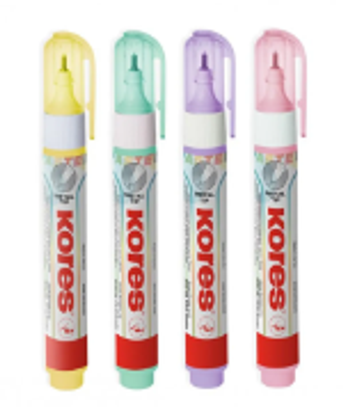 Corrector lápiz 8ml pastel Kores, en tonos pastel, borra errores con facilidad, ideal para apuntes.