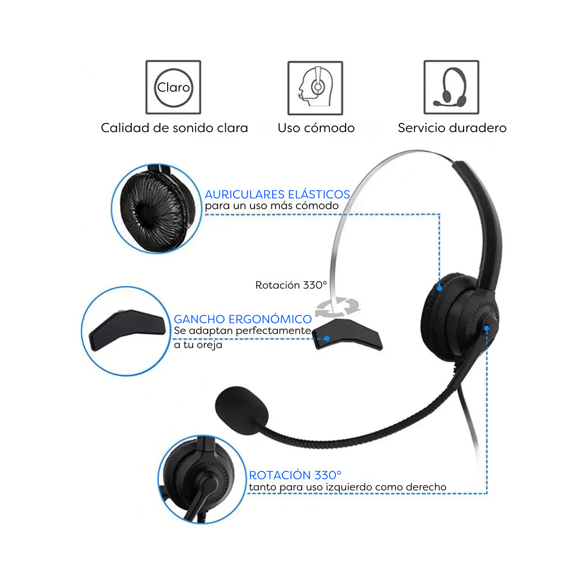La longitud de los auriculares del teléfono es de 15 cm, el ancho es de 15 cm y la altura es de 19 cm. La longitud del cable es de 2,5 m. El auricular del teléfono es adecuado para usarse en telemercado, oficina de camiones, servicio al cliente, etc.