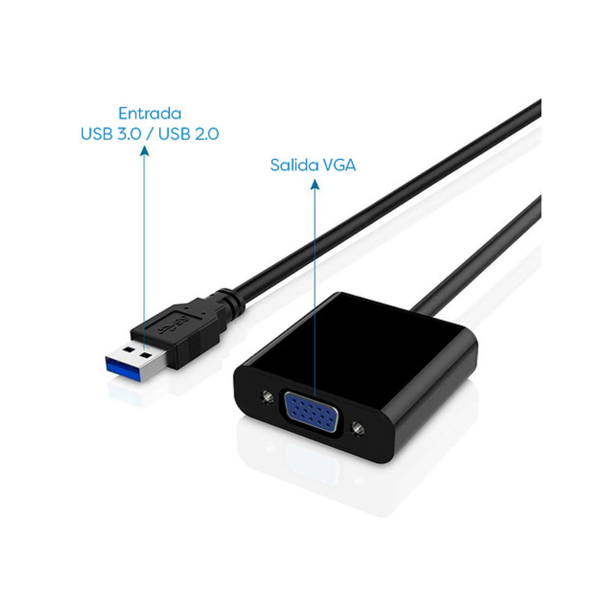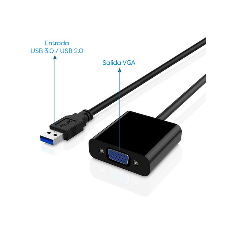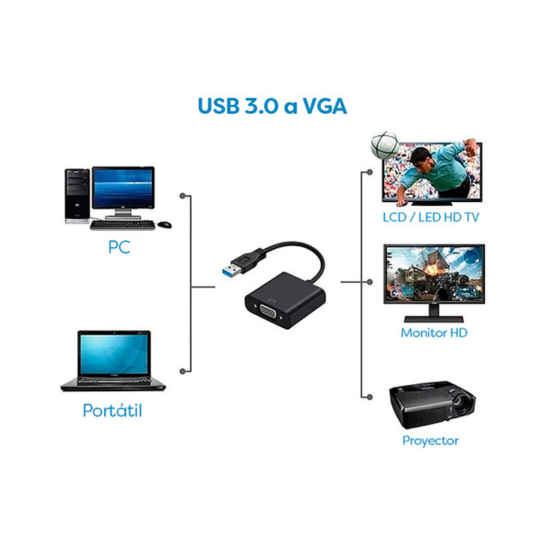 Este adaptador convierte un puerto USB 3.0 en una salida VGA, permitiéndote conectar fácilmente tu laptop o computador a una pantalla externa, monitor, proyector o televisor con entrada VGA.