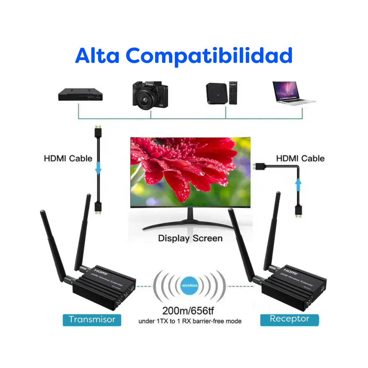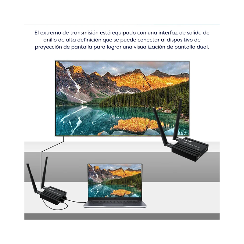 Este extensor inalámbrico HDMI utiliza módulos 2,4G y 5G para permitir una comunicación inalámbrica de alta velocidad y alto rendimiento entre productos electrónicos de consumo, ordenadores y dispositivos móviles. Combina una alta capacidad de ancho de banda y una fuerte capacidad de corrección de errores para transmitir vídeo HD. Transmite la señal hasta 200m en el área abierta, también atraviesa la pared.