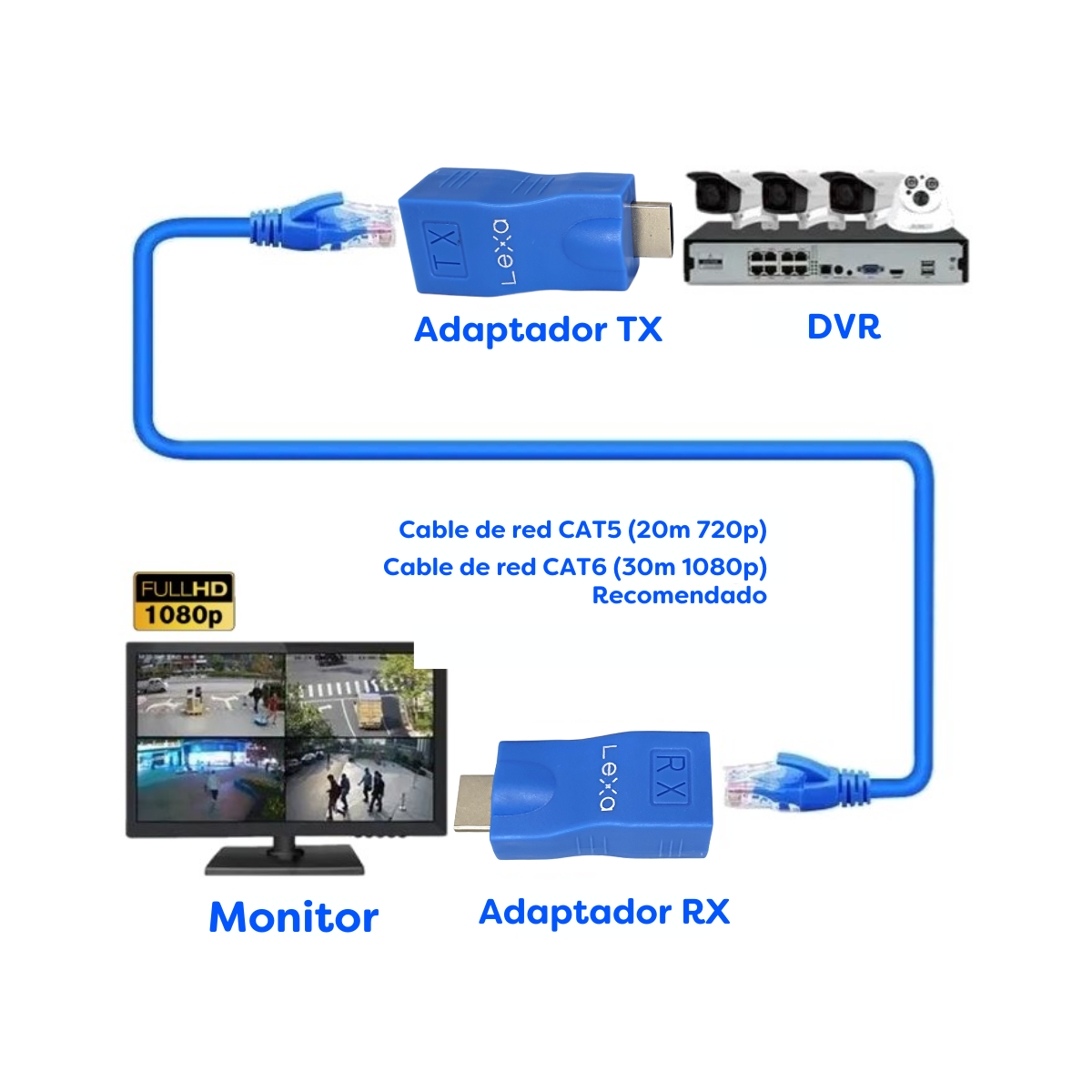 Importante: tenga en cuenta que para alcanzar los 30 metros se recomienda usar solo cable de red CAT6.