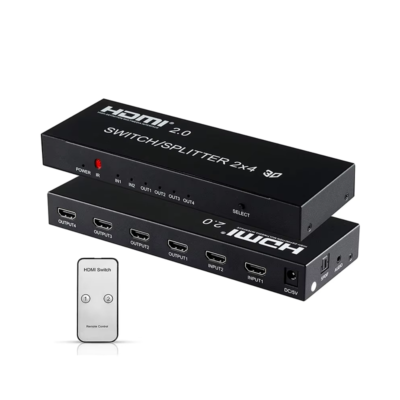 El divisor de conmutación HDMI 2.0 2x4 conecta dos fuentes HD a cuatro terminales de pantalla HD. Puede distribuir fácilmente la señal HD generada por 2 fuentes HD a 4 monitores o proyectores que admitan señales HD y también amplificar la señal HDMI. Las dos fuentes se pueden cambiar. entre sí. Este divisor de interruptor HDMI puede admitir formatos HD que incluyen 720p, 1080i, 1080p, 2160p, admite salida de audio para auriculares Salida de audio de 3,5 mm y SPDIF.