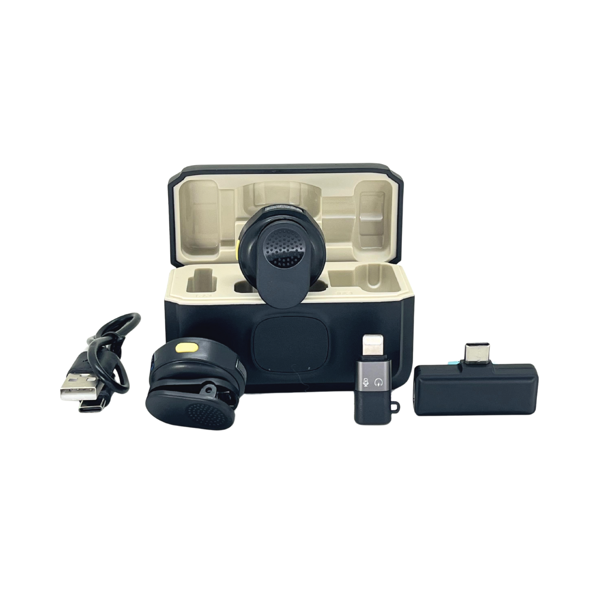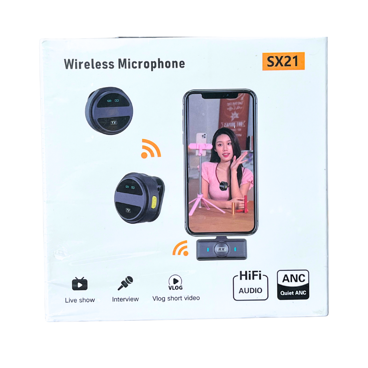 Micrófono inalámbrico SX21 con cancelación de ruido y conexión rápida. Ideal para entrevistas, vlogs y transmisiones en vivo.