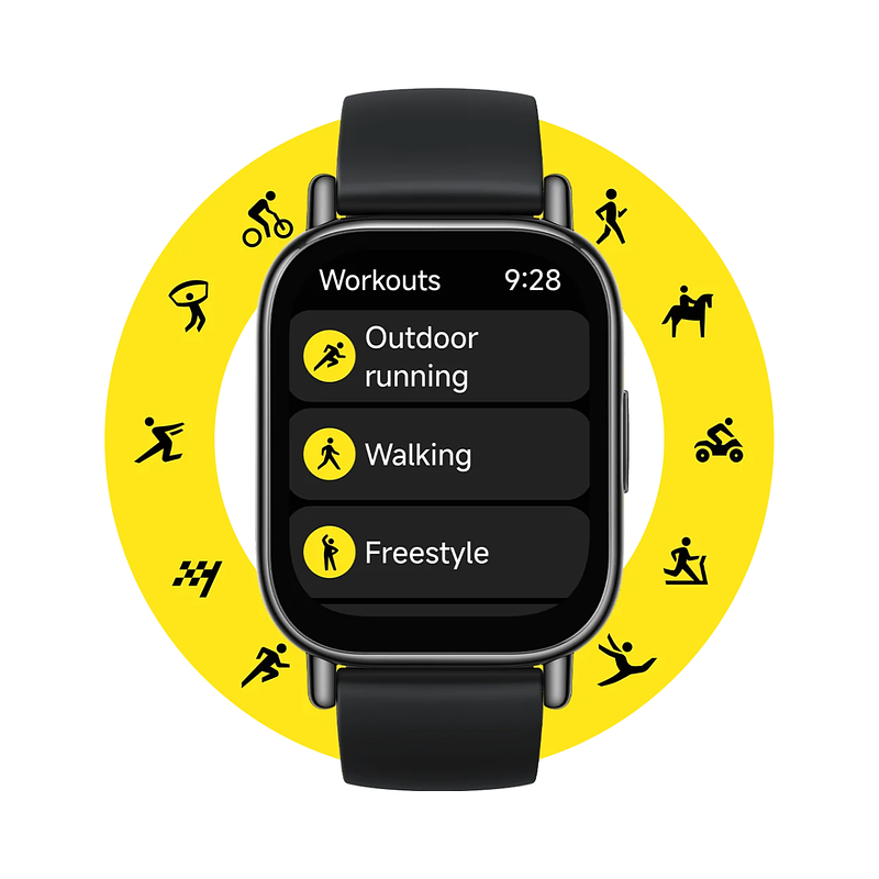 Pantalla cuadrada simple y clásica El diseño de pantalla cuadrada es elegante y liviano, con marco medio NCVM de alto brillo. Elije entre Dorado claro o Negro para tu compañero de entrenamiento perfecto.