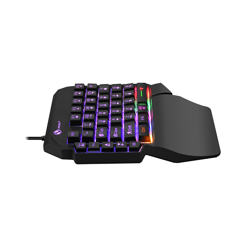 Teclado GK103 Single Handed diseñado para gamers que buscan precisión y control. Su formato compacto permite mayor libertad de movimiento, cuenta con iluminación RGB, teclas de respuesta rápida y iconos gamer de ayuda que facilitan cada jugada. Ideal para sesiones intensas de juego.