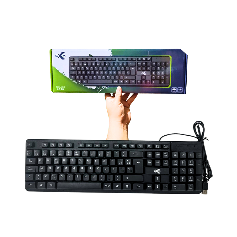 El teclado Exa modelo K330, diseñado para conexión USB, es una opción ideal tanto para entornos de oficina como para uso doméstico.