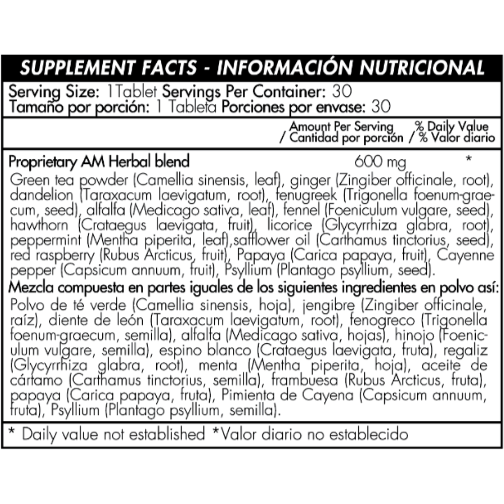 AM: Té verde (camellia sinensis, hoja), jengibre (zingiber officinale, raíz), diente de león (taraxacum laevigatum, raíz), fenogreco (trigonella foenum-graecum, semilla), alfalfa (medicago sativa, hojas), hinojo (foeniculum vulgare, semilla), espino blanco (grataegus laevigata, fruto), regaliz (glycyrrhiza glaba, raíz), menta (mentha piperita, hoja), aceite de cártamo (carthamus tinctorius, semilla), frambuesa (rubus arcticus, fruto), papaya (carica papaya, fruto), pimienta de cayena (capsicum annuum, fruto), psyllium (plantago psyllium, semilla)).