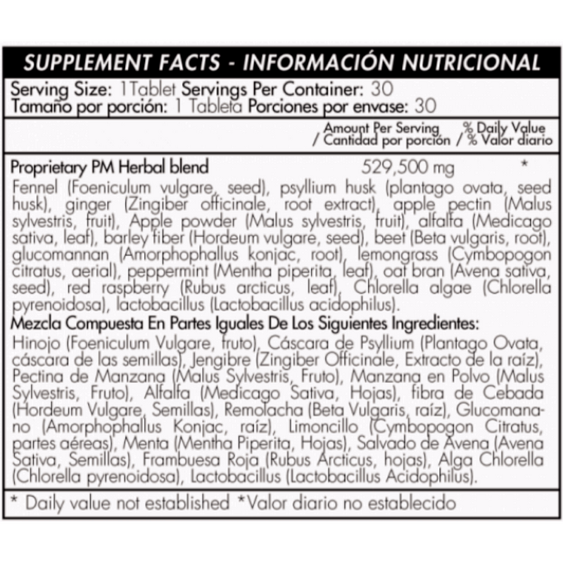 PM: Hinojo (foeniculum vulgare, fruto), cáscara de psyllium (plantago ovata, cáscara de las semillas), jengibre (zingiber officinale, extracto de la raíz), pectina de manzana (malus sylvestris, fruto), manzana en polvo (malus sylvestris, fruto), alfalfa (medicago sativa, hojas), cebada (hordeum vulgare, semillas), remolacha (beta vulgaris, raíz), glucomanano (amorphophallus konjac, raíz) limoncillo (cymbopogon citratus, partes aéreas), menta (mentha piperita, hojas), avena (avena sativa, semillas), frambuesa roja (rubus arcticus, hojas), alga chlorella (chlorella pyrenoidosa), lactobacillus (lactobacillus acidophillus).