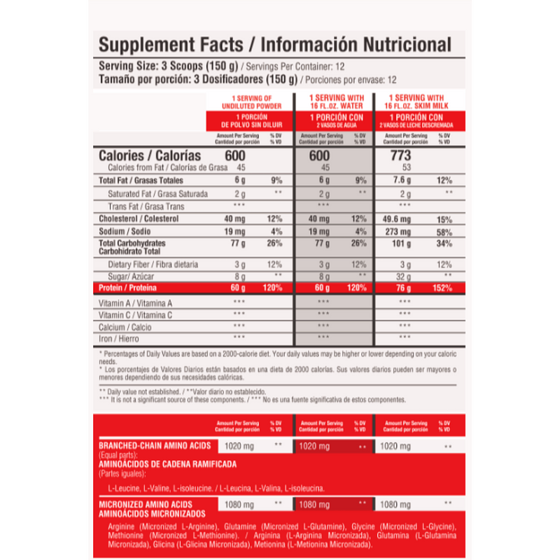 Proteína aislada de suero, Proteína concentrada de suero, Mezcla de carbohidratos: [(Polvo de maíz ceroso (Zea mays) 8.5 g, polvo de salvado de arroz (Oryza sativa) 8,5 g, mandioca (Manihot esculenta)8 g)], Avena en polvo, Maltodextrina, Azúcar (edulcorante natural), Leche de vaca sin grasa – aglomerado, Proteína de suero hidrolizado, Crema no láctea Richmix® LD-23, Sabor Vainilla (N&A), Sabor crema de vainilla (WONF), Lecitina de soya en polvo desaceitada (emulsionante), BCAA´s Aminoácidos de cadena ramificada L-Leucina, Valina, Isoleucina, Aminoacidos Micronizados L-Glutamina, L-Arginina, L-Glicina, L-Metionina (nutrientes), Albúmina de huevo, Goma de celulosa (Carboximetilcelulosa sódica (CMC)), Goma Xantana, Polvo de goma guar (espesantes), Dióxido de silicio (antiaglomerante), Cloruro de sodio (anticompactante), Sucralosa, Acesulfame potásico (edulcorantes artificiales).