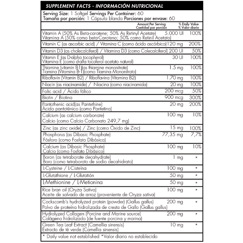 L-Cisteína (aminoácido), L-Glutatión (aminoácido), L-Metionina (aminoácido), Aceite de Salvado de Arroz proveniente de (Oryza sativa) (vegetal), Extracto de Crestas de Gallo (Gallus gallus) (proteína animal), Colágeno Hidrolizado de fuente porcina y marina (proteína), Extracto de hojas de té verde (Camellia sinensis) (vegetal), Vitamina A (vitamina), Vitamina C (vitamina), Vitamina D3 (vitamina), Vitamina E (vitamina), Riboflavina (B2) (vitamina), Tiamina (Vitamina B1) (vitamina), Niacina (B3) (vitamina), Ácido Fólico (vitamina), Biotina (vitamina), Ácido Pantoténico (como Pantetina) (vitamina), Calcio (mineral), Zinc (mineral), Fósforo (mineral), Calcio (mineral), Boro (mineral).
