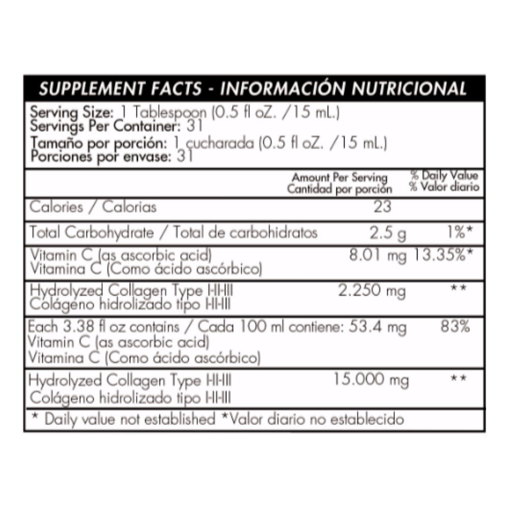Colágeno hidrolizado (mayor cantidad del tipo I, II y III) (origen animal), Ácido ascórbico (vitamina C)(vegetal).