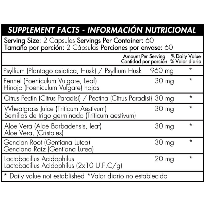 Cáscara fibra de psilio, Hinojo (foeniculum vulgare Mill), Pectina cítrica (citrus pectin), Trigo (triticum aestivum), Genciana (gentiana lutea), Lactobacillus Acidophilus (2x10? UFC/G).