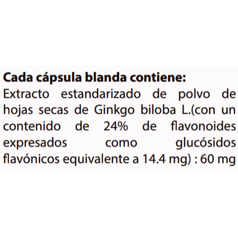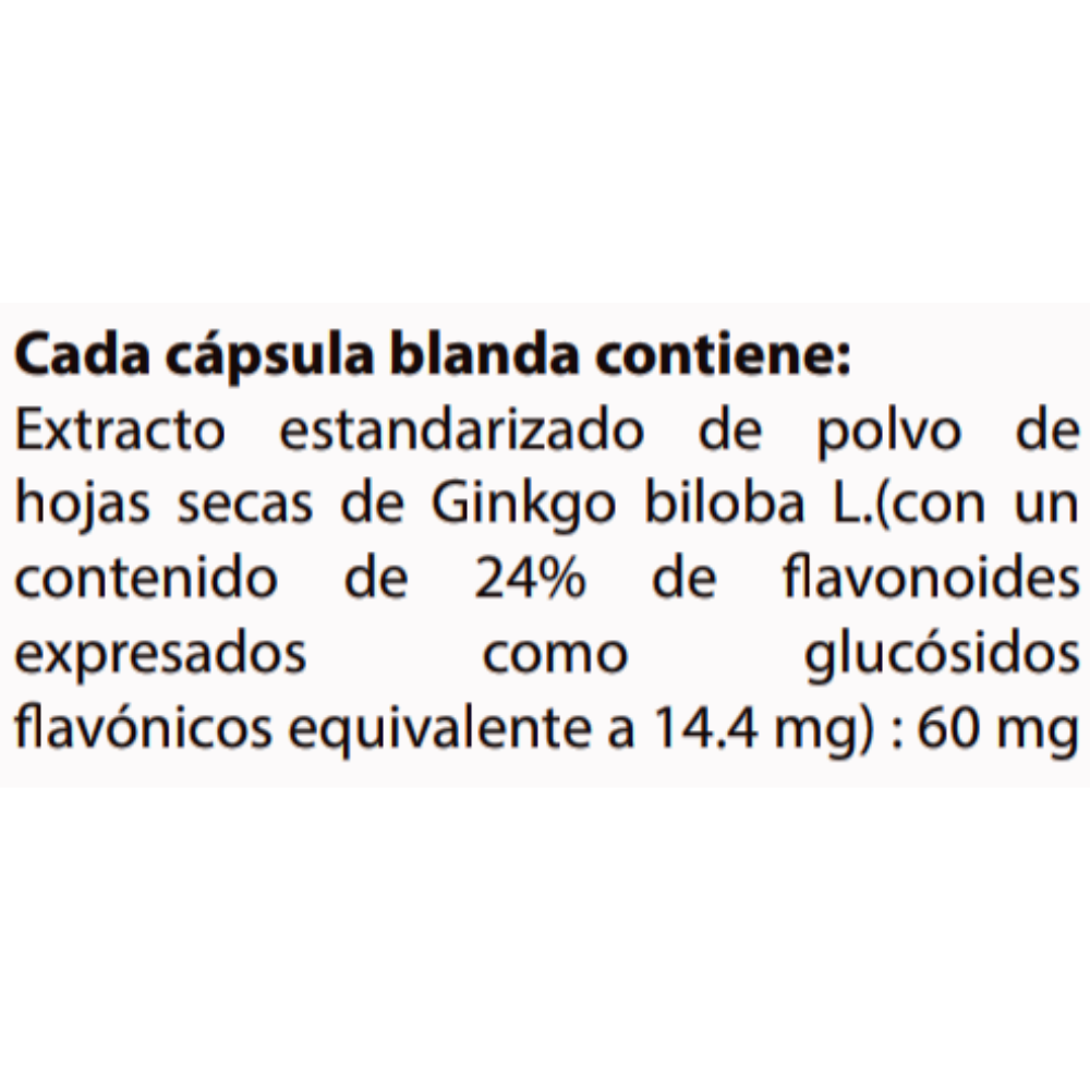 Cada cápsula blanda contiene: Extracto estandarizado de polvo de hojas secas de Ginkgo biloba L.(con un contenido de 24% de flavonoides expresados como glucósidos flavónicos equivalente a 14.4 mg) : 60 mg