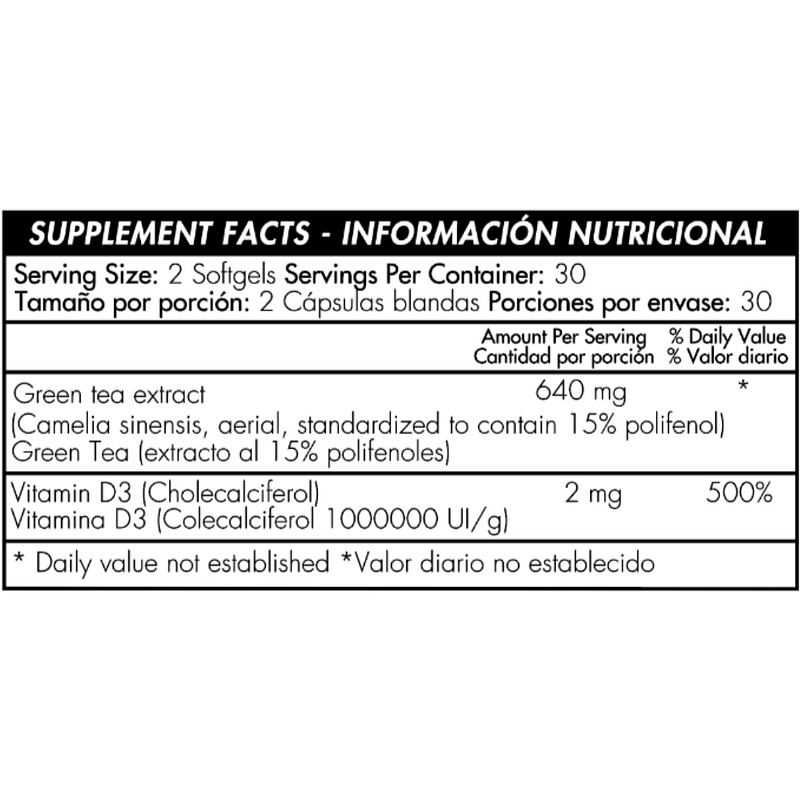 Té verde (extracto de polifenoles al 15%). Secundarios: Vitamina D3 (colecalciferol) (vitamina de origen animal).