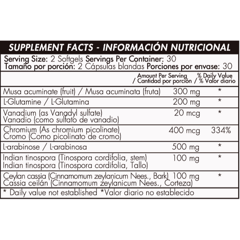 Musa acuminata (fruta), L-Glutamina (aminoácido de origen animal), Picolinato de Cromo (mineral), L-Arabinosa (azúcar derivado de la goma arábiga), Tinospora Cordifolia (vástago del arbusto), Ceylan cassia (Cinnamomum zeylanicum) (corteza del árbol), Sulfato de Vanadio (mineral).