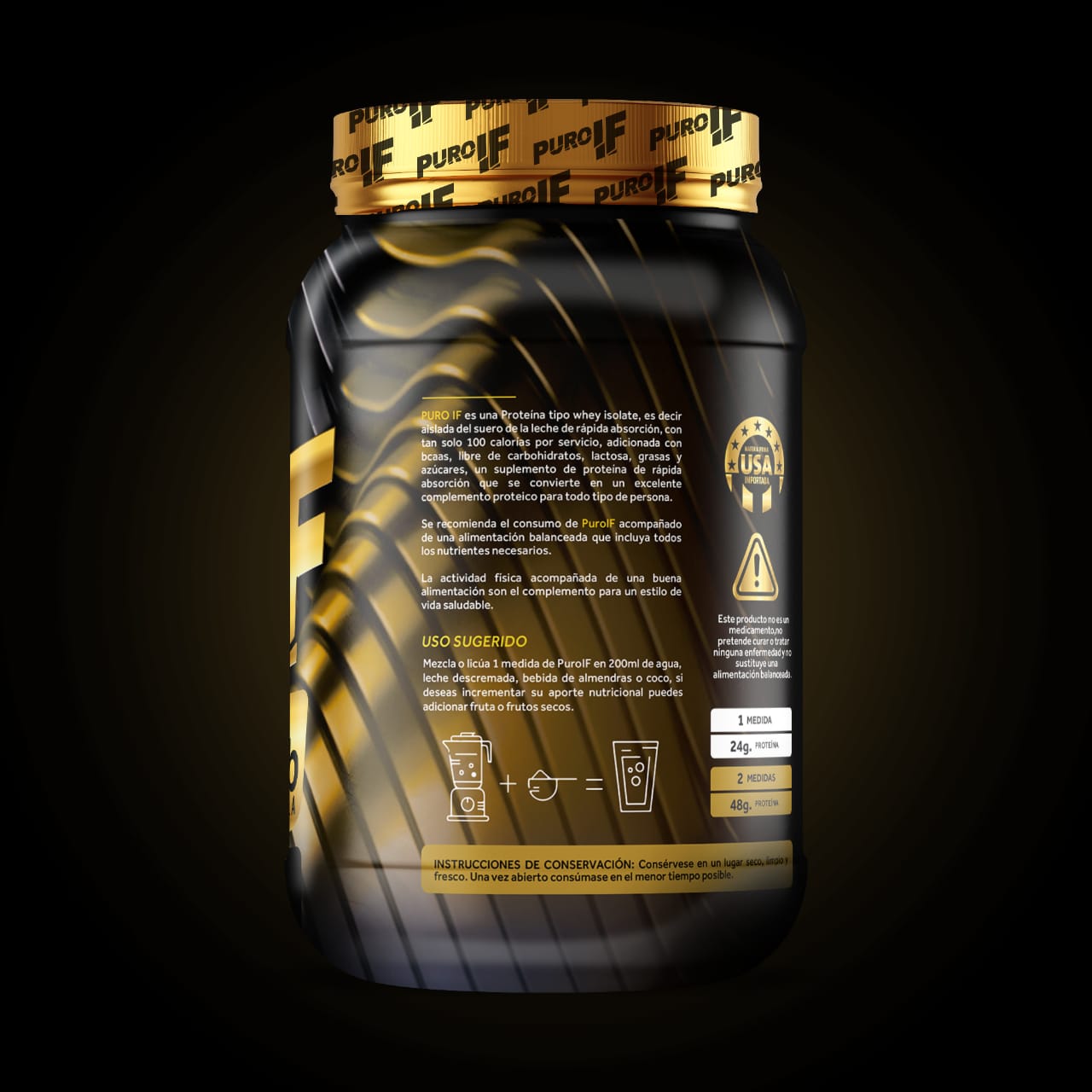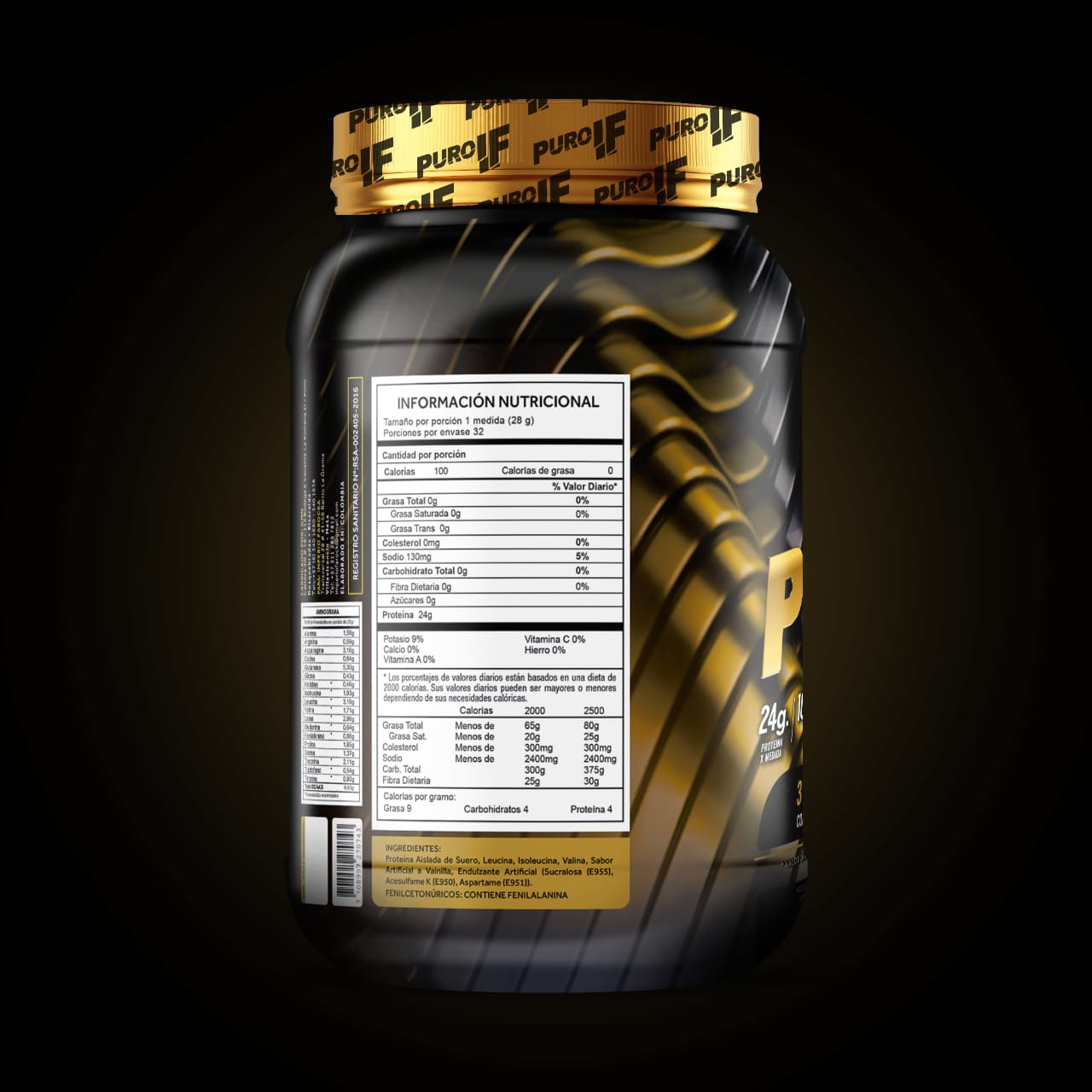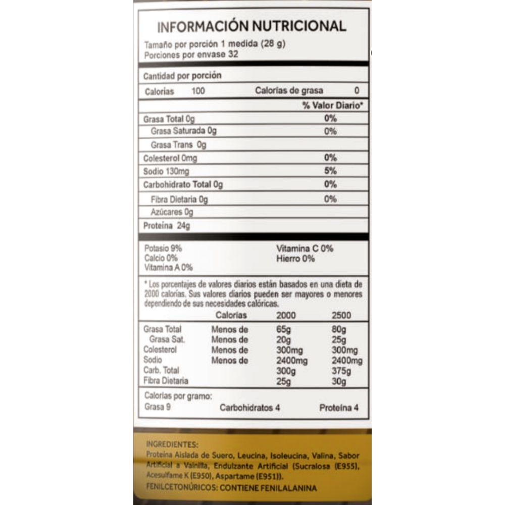 Es una proteína 💯% limpia, libre de grasa, lactosa y azúcar, que te aporta 24 gramos de proteína, por 28 gramos del producto, 1000 MG de aminoácidos y 0 carbohidratos por servicio.