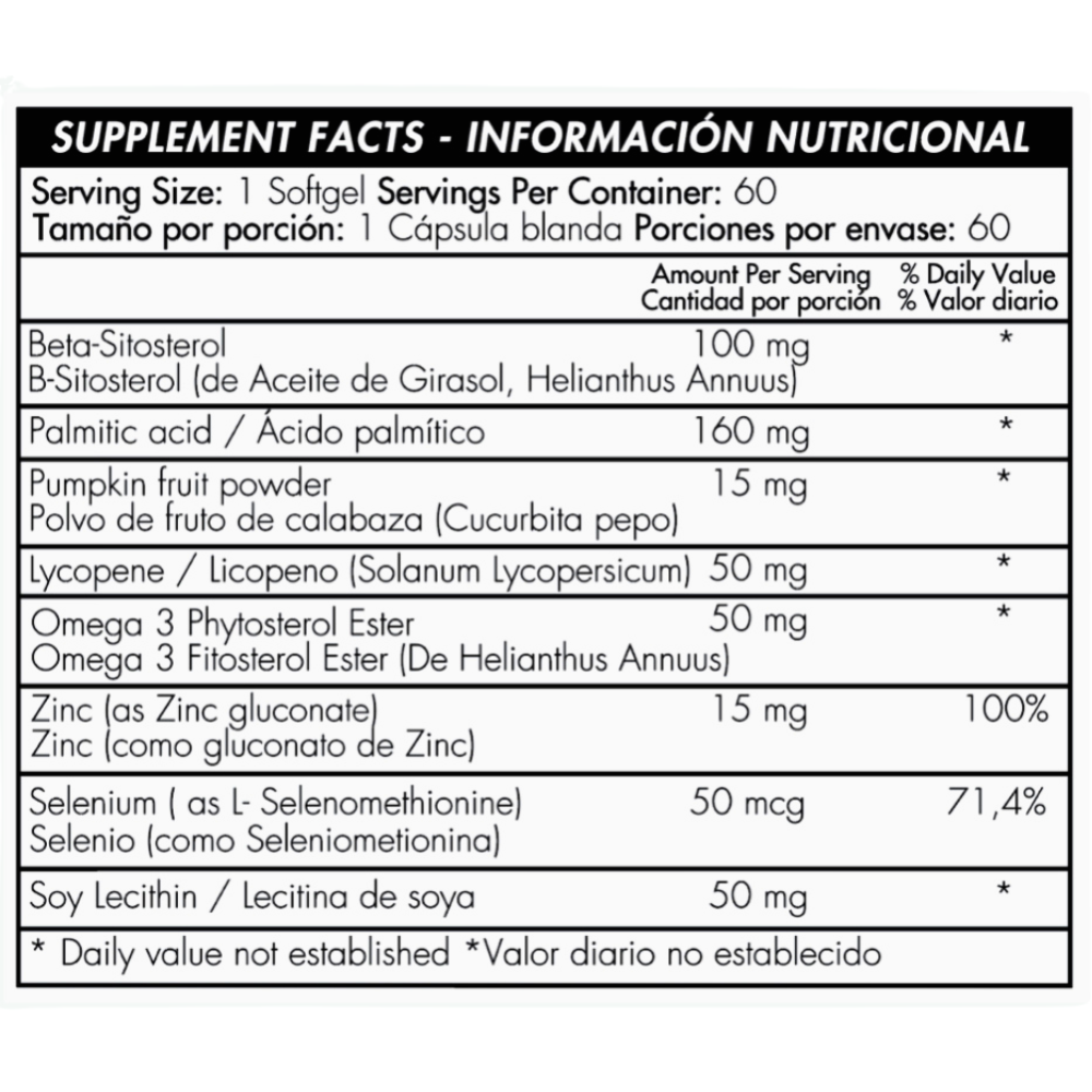 Ácido palmítico (vegetal), Licopeno (solanum lycopersicum) (vegetal), Omega 3 fitoesterol éster (de helianthus annuus) (vegetal), B-sitosterol de aceite de girasol (helianthus annuus) (vegetal), Polvo de fruto de calabaza (cucurbita pepo) (vegetal), Gluconato de zinc (mineral), Selenio (mineral), Lecitina de soya (vegetal).