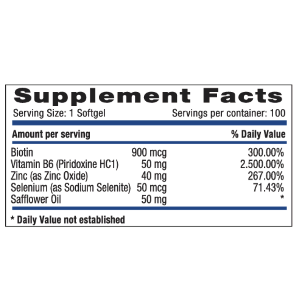 La Biotina, conocida también como vitamina B-8 es una vitamina hidrosoluble que debe ser consumida diariamente. Esta vitamina participa como coenzima en múltiples reacciones de replicación celular rápida (piel, cabello, células del tracto gastrointestinal, células de revestimiento axónico, etc.).La Biotina interviene en el metabolismo de carbohidratos, aminoácidos, purinas y especialmente en la síntesis y degradación de grasas.La Biotina es útil para el tratamiento de eczemas, dermatitis seborreica, piel seca y descamativa, dolores musculares, mantenimiento de un cabello saludable y la prevención y tratamiento de la caída y en personas con diabetes tipo II se han encontrado bajos niveles de biotina y esta parece estar involucrada en la síntesis y liberación de insulina.