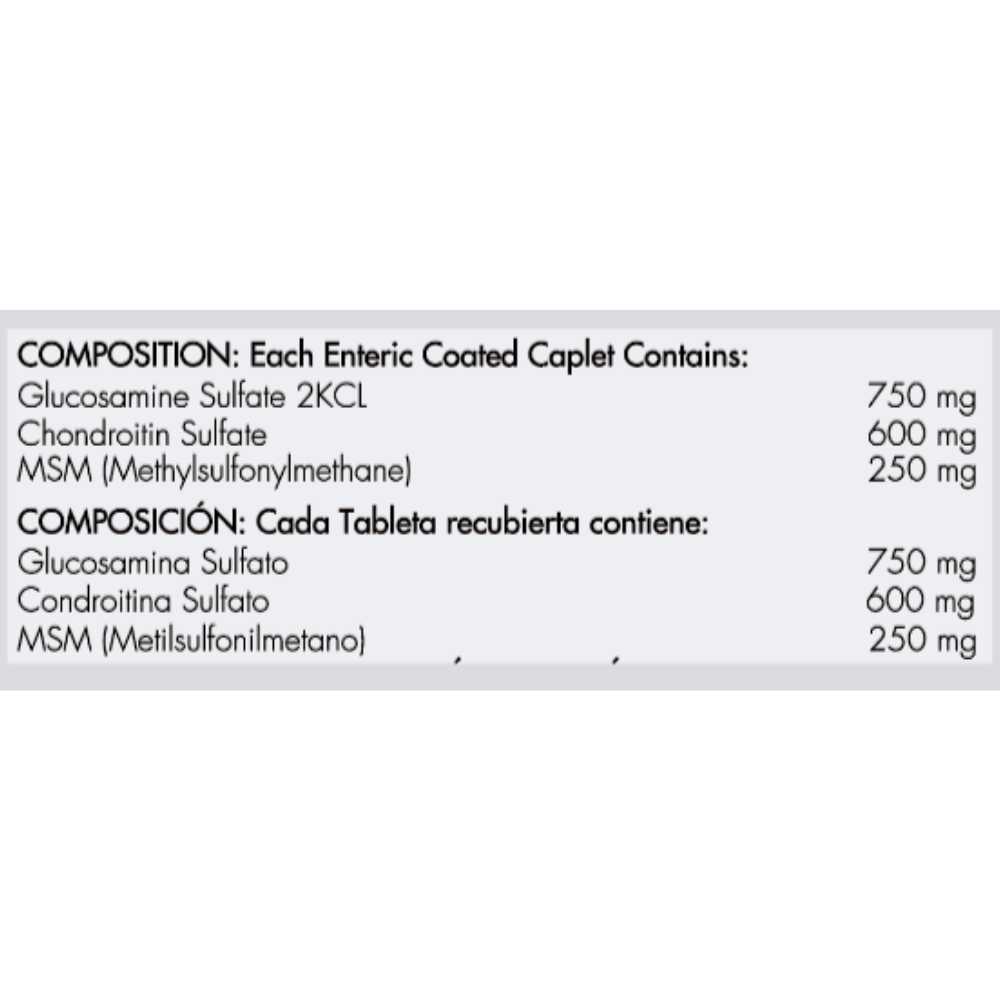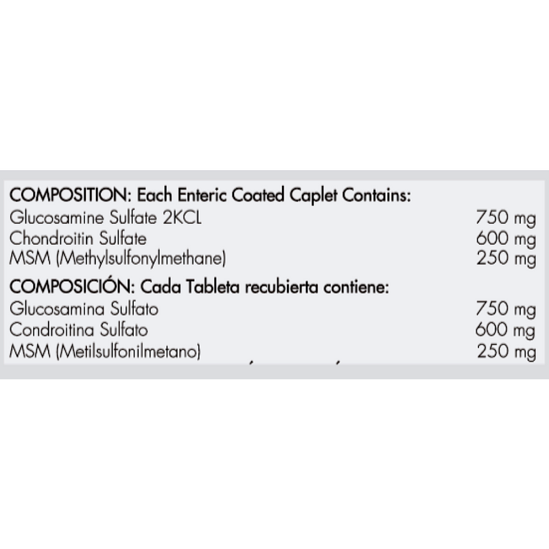 Sulfato de Glucosamina (proteína de origen marino), Sulfato de Condroitina (proteína de origen marino), MSM (mineral).