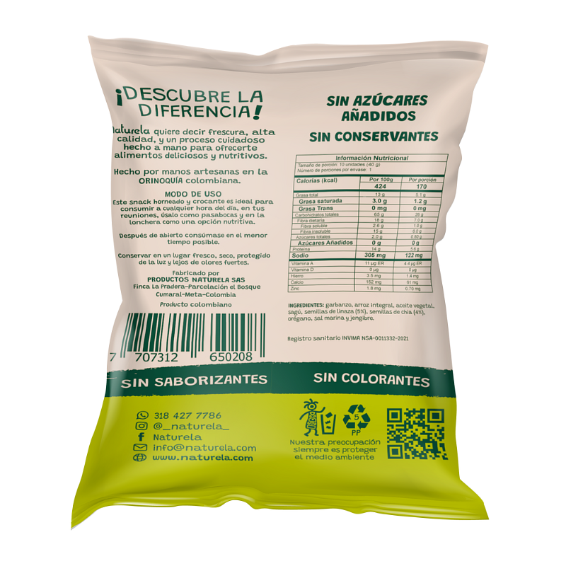 Arroz Integral, Garbanzos, Sagú, Semillas de Linaza, Semillas de Chía, Orégano, Sal Marina y Jengibre.