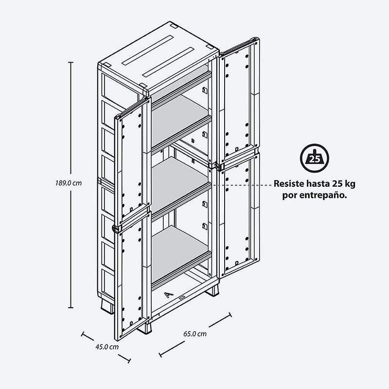 Cuatro entrepaños ajustables que resisten hasta 25 Kg cada uno.