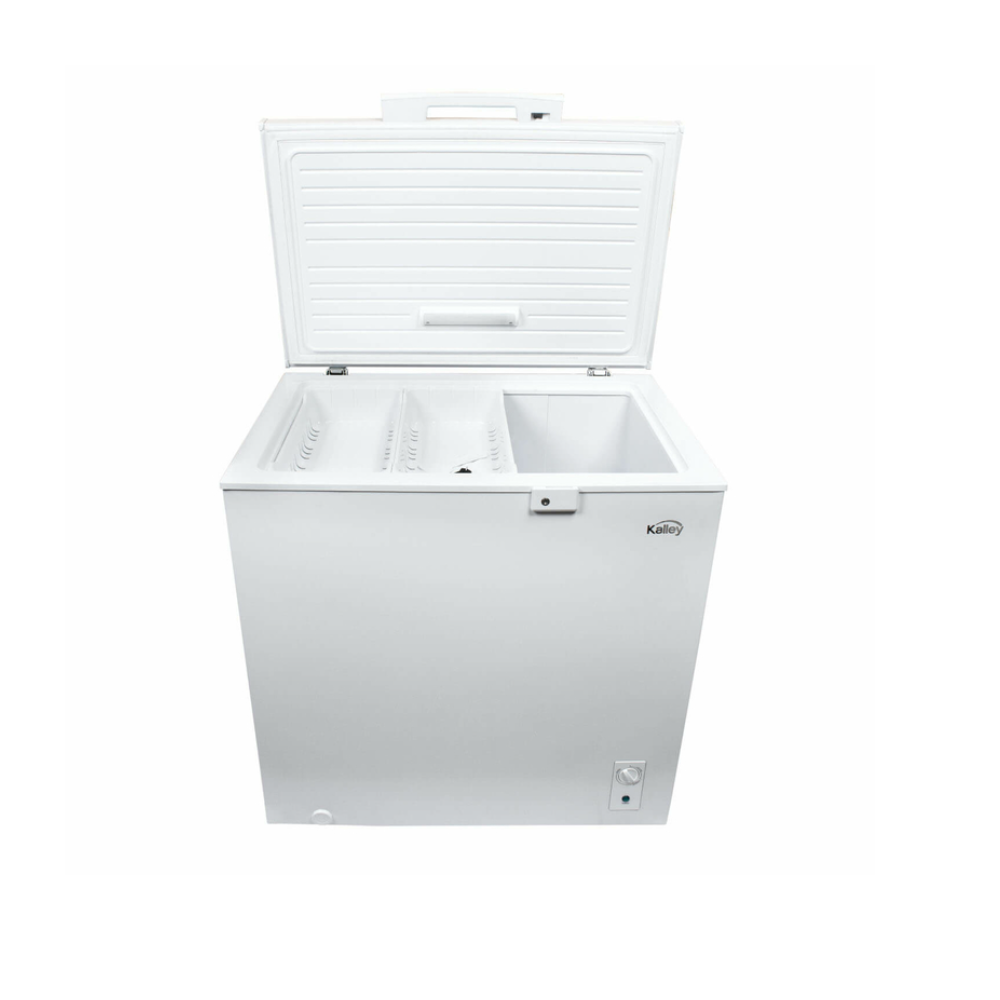 Este congelador Kalley de 198 litros cuenta con control de temperatura externo, sistema de seguridad, iluminación LED, 2 canastillas removibles de plástico, ruedas para fácil desplazamiento y drenaje de limpieza.