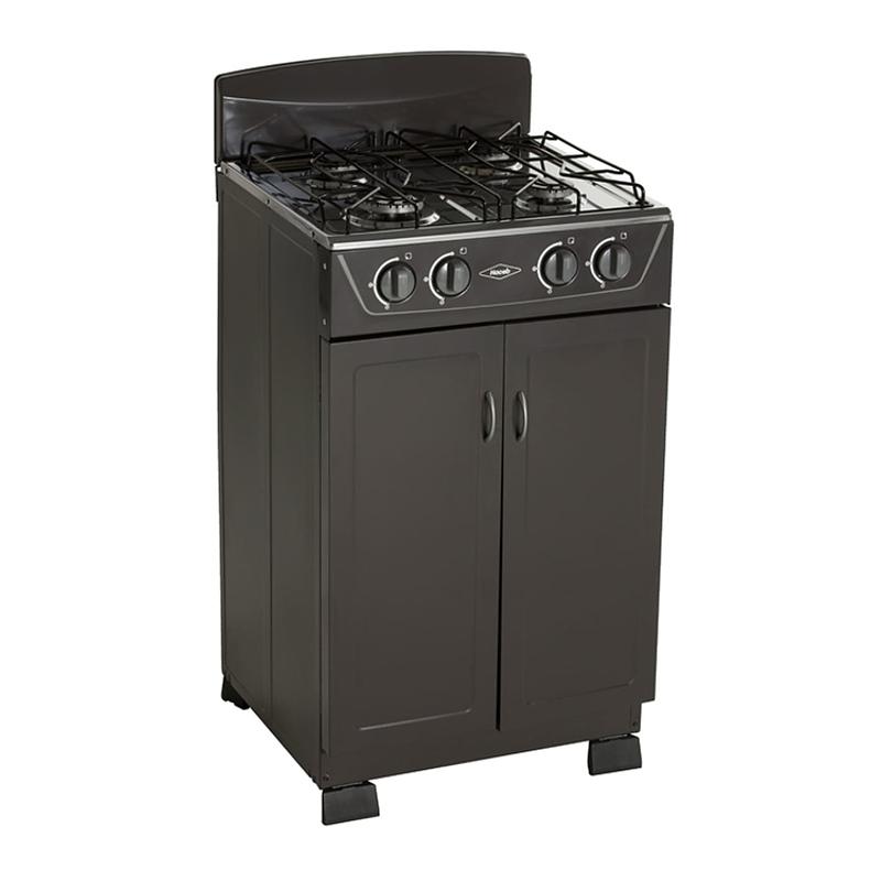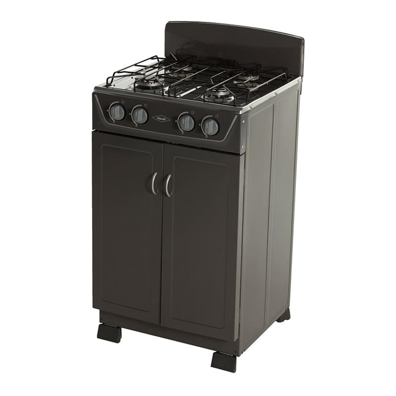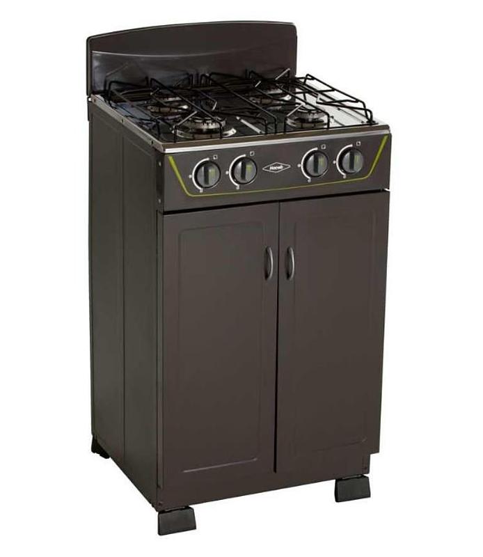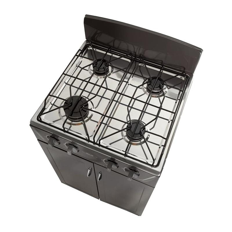 Estufa de mesa en acero inoxidable gris con gabinete, a gas natural. Cuatro quemadores.