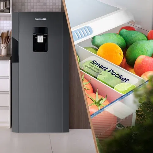 Nevera Frost de la nueva línea de neveras challenger lúmina, de 239 Litros Brutos de clase tropical de bajo ruido y bajo consumo energetico, con descongelación semiautomática, cuenta con refrigerante R600a que conlleva a una mayor eficiencia energética y reduce el riesgo del impacto sobre el calentamiento global y el daño a la capa de ozono. Incluye un novedoso Smart Pocket en el compartimiento de frutas y verduras pensado para alimentos iniciados.
