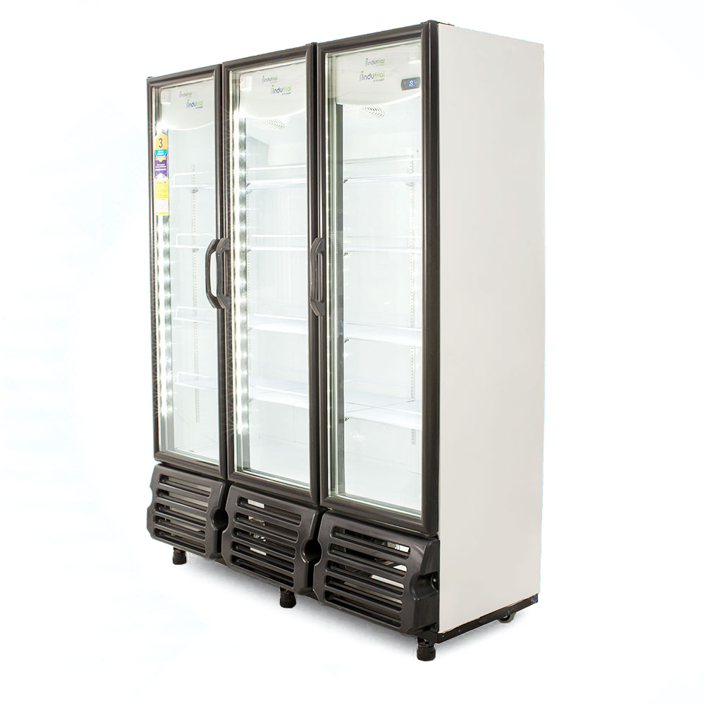 Nevera vertical Tres Puertas, conserva productos pre empacados, bebidas, lacteos, carnes frias y verduras.