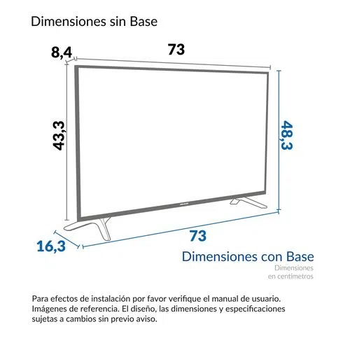 Con Base: 73 cm X 48,3 cm X 16,3 cm - Sin Base: 73 cm X 43,3 cm X 8,4 cm (Largo x Alto x Ancho) |