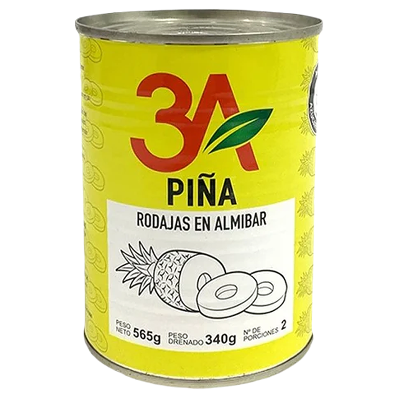 Piña En Rodajas frescos y maduros, en mitades y un líquido de gobierno compuesto por agua, azúcar y ácido cítrico.