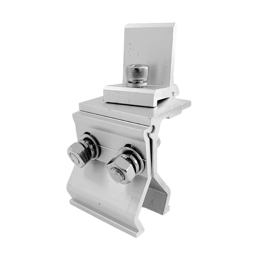 Este accesorio es especialmente para cubiertas Standing Seam Grafada.La abrazadera se puede enganchar en la posición deseada de la sección del carril y sostiene el Panel Solar, la altura se puede ajustar a la altura del marco del módulo utilizando un tornillo de toma de hexágono