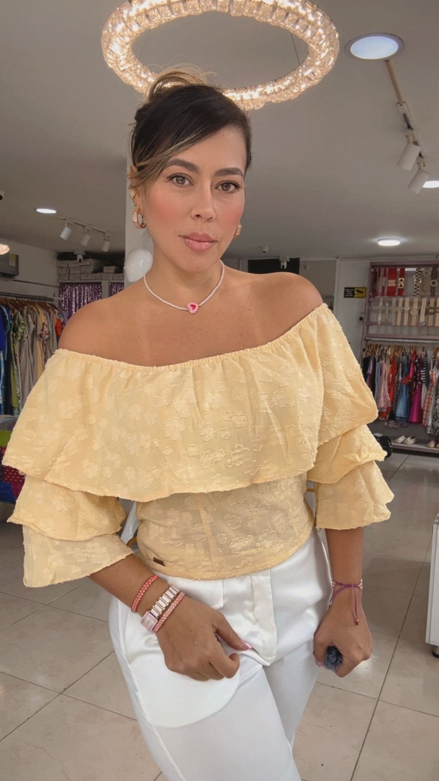 Linda blusa campesina amarilla con cuello bandeja y manga tres cuartos. Su delicado bordado de flores le da un toque fresco, femenino y elegante.