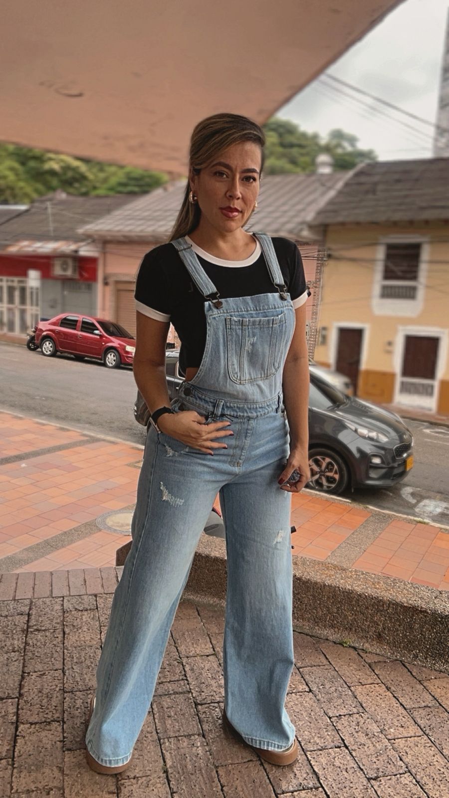 Jardinera de jean claro con bolsillo frontal y tirantes ajustables con ganchos metálicos. Cómoda, versátil y perfecta para looks modernos, casuales