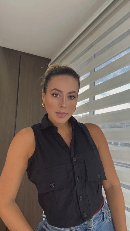 Chaleco negro en tela seda de Studio F, con acabado sofisticado y versátil, perfecto para crear looks modernos y elegantes en cualquier ocasión.