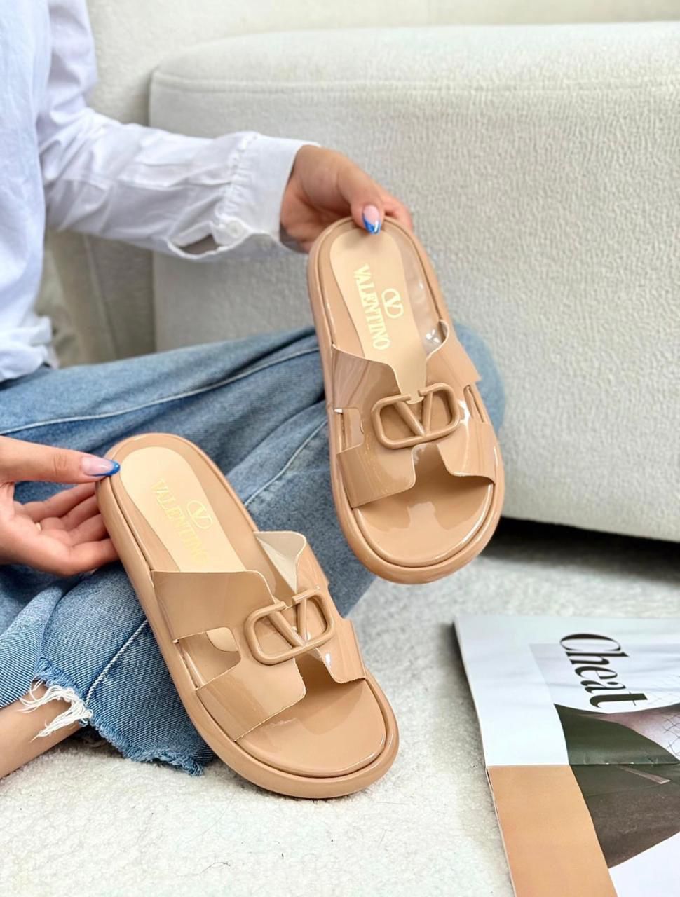 Elegantes sandalias en material PVC tono camel estilo Valentino, modernas y versátiles. Perfectas para complementar tus looks con un toque chic.