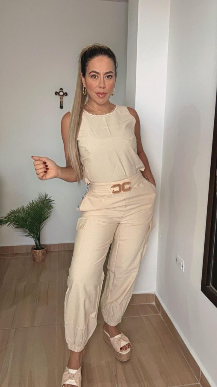Este set en tono mantequilla es súper hermoso y perfecto para un look sofisticado y cómodo. Confeccionado en lino de alta calidad, ofrece frescura