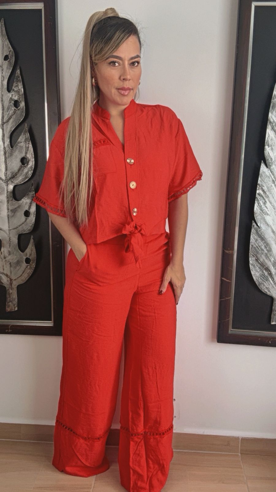 Set súper lindo y fresco en tela ligera, cómodo y elegante. Diseño moderno con detalles delicados y color vibrante, ideal para looks casuales