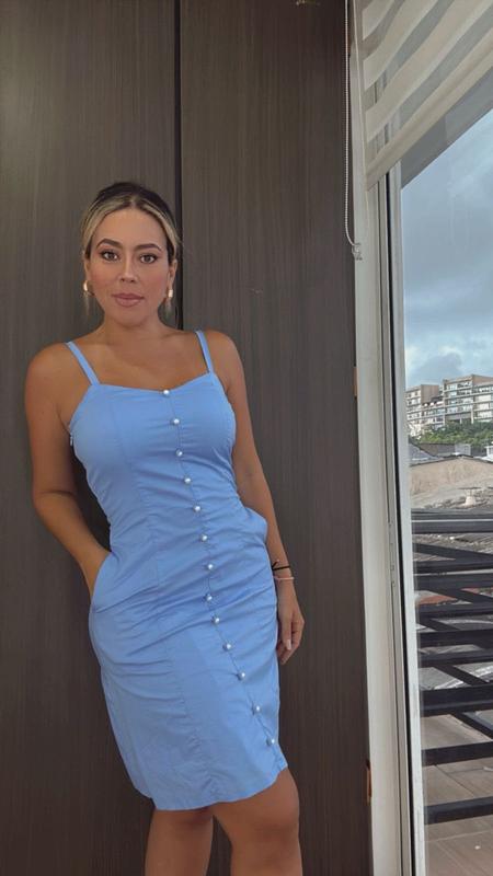 Vestido azul bebe con bolsillos y botones prácticos, cómodo y funcional, ideal para un look femenino y versátil en cualquier ocasión.
