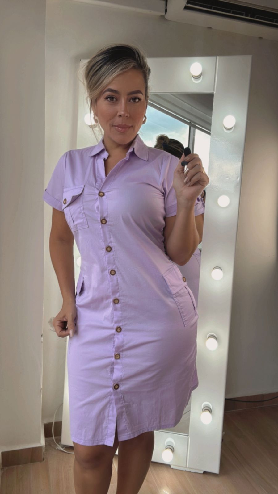 Vestido lila tipo cargo, moderno y versátil, con un estilo casual y cómodo ideal para un look urbano y con mucho estilo.