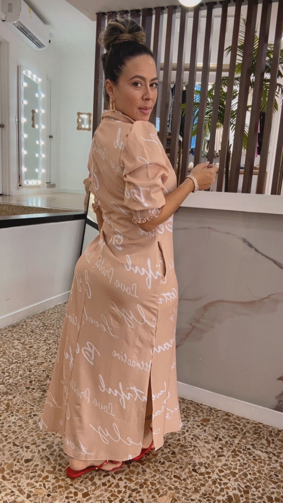 Vestido largo camisero en seda Studio F, suave y ligera. Estampado moderno y corte elegante, ideal para un look fresco y sofisticado.