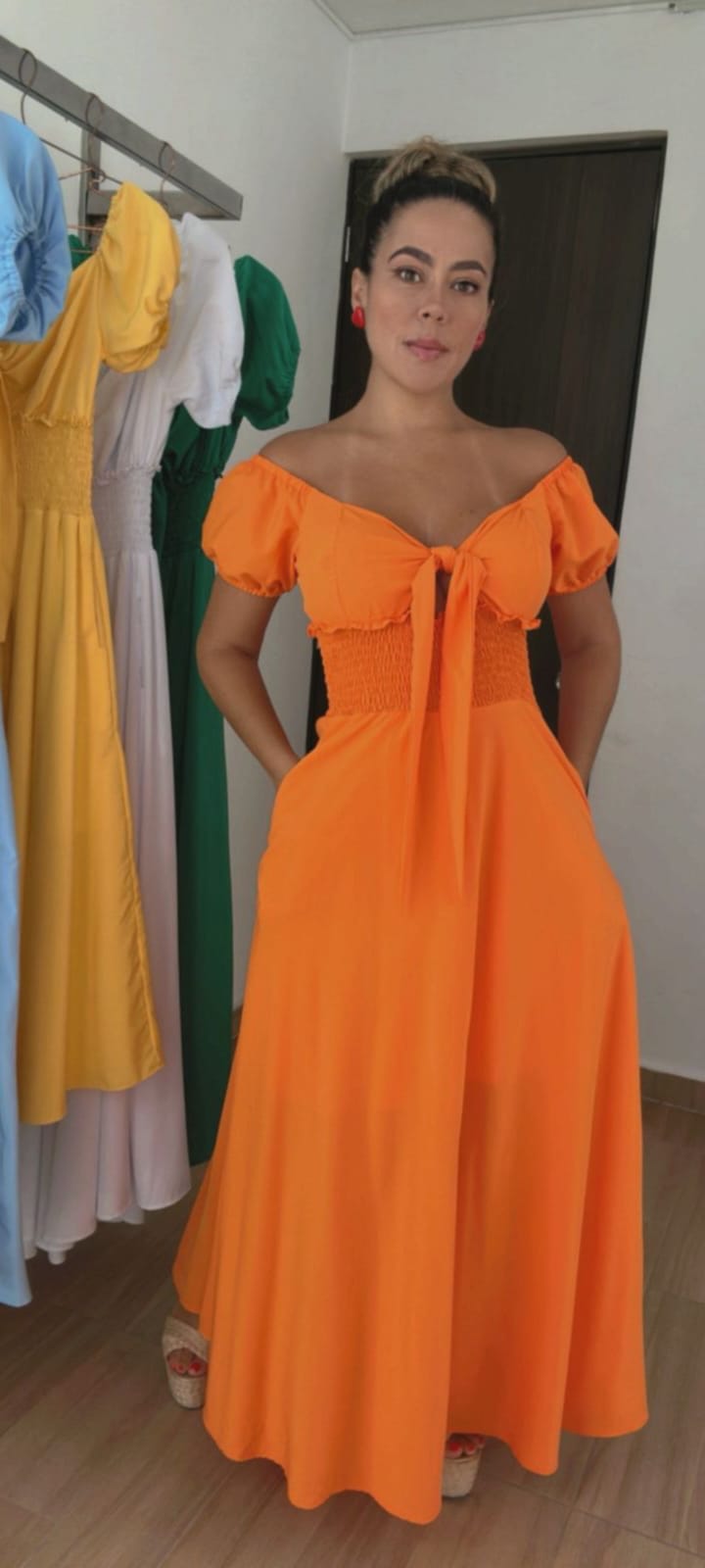 Vestido naranja de manga media con ajuste de moño en el busto, elegante y femenino. Diseño ceñido que realza la silueta, perfecto para un bello lock.