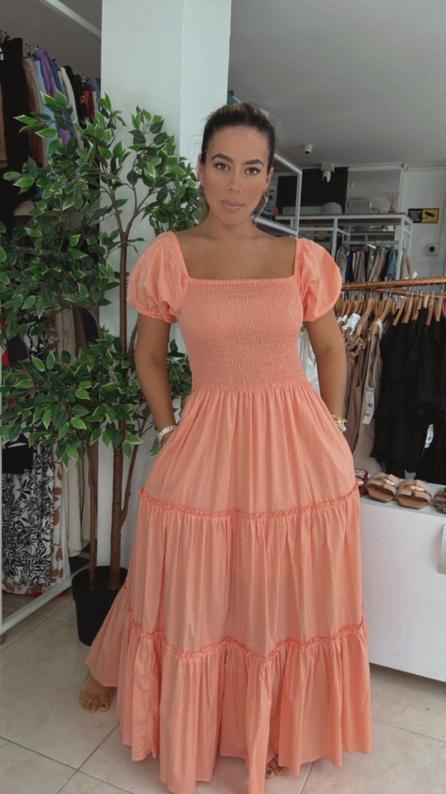 Vestido largo color salmón con escote cuadrado, cuerpo tipo nido de abeja y mangas bombachas. Ideal para días cálidos y looks femeninos.