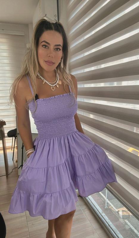 Vestido corto lila, diseño de tiras. Corte ajustado o fluido, con tela ligera y fresca. Ideal para un look casual y femenino.