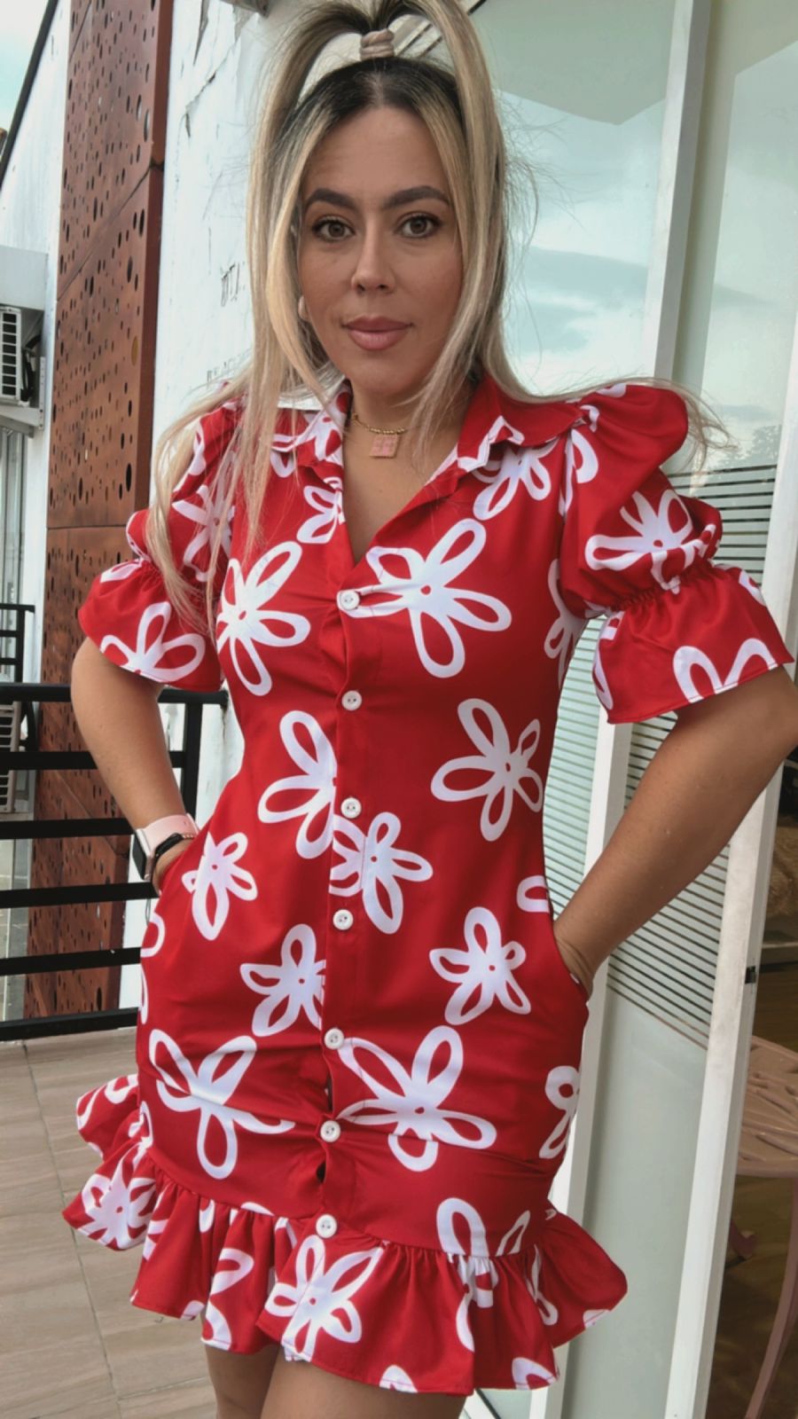Vestido rojo estampado, sofisticado, con un diseño que resalta la silueta y aporta un toque de pasión y estilo. Ideal para cualquier ocasión especial